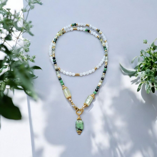 Boucles d'oreilles et sautoir en aventurine verte et charoïte