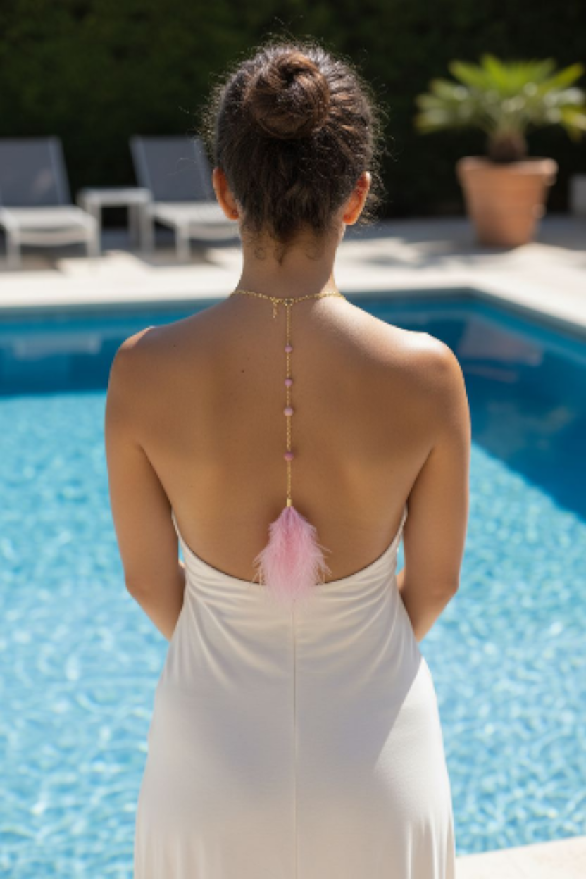 Découvrez la magie de nos sautoirs de dos "Élégance Enchantée", une fusion parfaite de rhodonite et de plume rose poudré. Ces pièces uniques, en plaqué or 14k et acier inoxydable, sont conçues pour apporter une touche bohème romantique et une élégance subtile à votre style.
